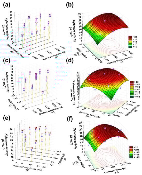 Spectral graphs of the CCD matrix (a,c,e) and response surface plots of xylanase production from A. tamarii Kita (b,d,f) show the interaction between barley bagasse and volume of Adams’ medium (a,b), barley bagasse and culture time (c,d) and culture time and volume of Adams’ medium (e,f). The numbers in the spectral graphs (a,c,e) refer to the assay’s numbers in Table 1.
