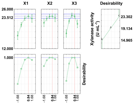 The response surface plots described by second-order polynomial equations were generated to determine each variable’s optimal level for xylanase production (Figure 1b,d,f). These representations were formulated for different combinations of two factors at the time, while the third factor was kept constant. The spectral graphs (Figure 1a,c,e) facilitate understanding each response surface generated, showing the enumerated assays of the CCD matrix (Table 1). According to the desirability profile, which detailed the precise proportions of the independent variables [41] (Figure 2), the highest predicted value of xylanase for the model (23.512 U mL−1) would be obtained with 0.814 g (+0.84) of BB (X1), 20 mL (+0.84) of Adam’s’ medium (X2), and 144 h (+0.84) of culture time (X3). The highest value obtained with CCD (23.302 U mL−1 of xylanase) was observed in assay no. 10 (central point replicate) with 0.625 g of BB, 15 mL of Adams’ medium, and 120 h of culture time). Therefore, validation of the experimental model was carried out by conducting additional experiments under the conditions of the central point (assays 18, 19, and 20; Table 1). This combination led to xylanolytic activity of 23.122 ± 0.306 U mL−1 (mean), comparable to the model-predicted value (23.011 U mL−1). Thus, it can be concluded that this regression model has excellent predictive capacity for xylanase production.