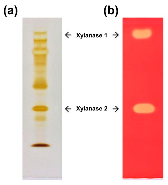 (a) Non-denaturing PAGE and (b) zymogram of the xylanolytic activities from A. tamarii Kita crude extract.