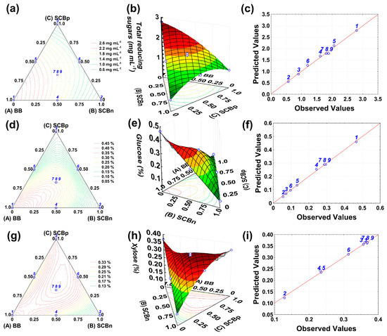 Contour plots and surface response plots from mixture design experiments showing the interaction between the three agro-industrial residues for the production of fermentable sugars after 48 h of hydrolysis: reducing-sugar yield (mg mL−1) (a,b); glucose yield (%) (d,e); xylose yield (%) (g,h). The variation in the quality of the fit is revealed by the plot of the predicted responses against the observed responses: reducing sugar yield (mg mL−1) (c); glucose yield (%) (f); xylose yield (%) (i). The numbers in the graphs (a,c,d,f,g,i) refer to the assay’s numbers in Table 3.