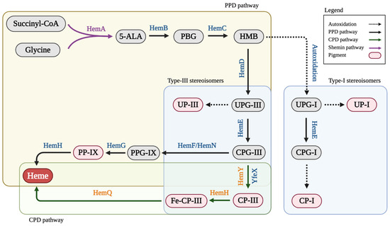 Heme is an essential compound in various hemoproteins, such as hemoglobin, myoglobin, and cytochromes, and plays a critical role in oxygen transportation, energy generation, and several enzymatic activities [1]. In bacteria, heme can be naturally synthesized via two distinct pathways: i.e., protoporphyrin-dependent (PPD) and coproporphyrin-dependent (CPD) pathways [2], with the PPD pathway being predominantly present in Gram-negative bacteria and the CPD pathway in Gram-positive bacteria [3]. In both pathways, heme biosynthesis starts with the formation of 5-aminolevulinic acid (5-ALA) via either the C4 or C5 pathway [4] (Figure 1). Subsequently, the enzyme porphobilinogen synthase (HemB) mediates the fusion of two 5-ALA molecules, yielding porphobilinogen (PBG). Then, PBG deaminase (HemC) interconnects and cyclizes four PBG molecules to form a linear tetrapyrrole, hydroxymethylbilane (HMB) [5]. At this metabolic node, the heme biosynthetic pathway diverges to form either of the two stereoisomers, i.e., uroporphyrinogen I (UPG-I) via autoxidation or uroporphyrinogen III (UPG-III) via uroporphyrinogen III synthase (HemD). Uroporphyrinogen decarboxylase (HemE) decarboxylates the four acetate residues of UPG-I to form coproporphyrinogen I (CPG-I), which is spontaneously oxidized to form coproporphyrin I (CP-I) as a metabolic end product [6]. Similarly, HemE mediates the conversion of UPG-III to coproporphyrinogen III (CPG-III), which is enzymatically converted to coproporphyrin III (CP-III) via coproporphyrinogen III oxidase (HemY) or porphyrinogen peroxidase (YfeX). Note that CPG-III represents the final shared precursor in the PPD and CPD pathways, both of which lead to the formation of heme via its respective precursors of protoporphyrin IX (PP-IX) and CP-III.