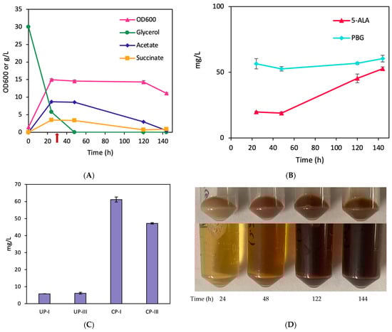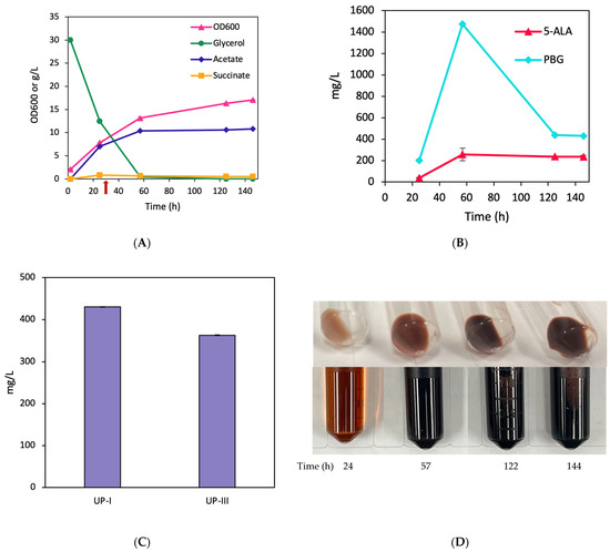 Aerobic bioreactor cultivation of BA001 for porphyrin biosynthesis. Time profiles of (A) cell density (OD600), glycerol consumption, and acetate/succinate formation (the red arrow shows glycine supplementation), (B) 5-ALA and PBG biosynthesis, and (C) UP biosynthesis. (D) Image of CFM and cell paste samples at different time points. All values are reported as means ± SD (n = 2).