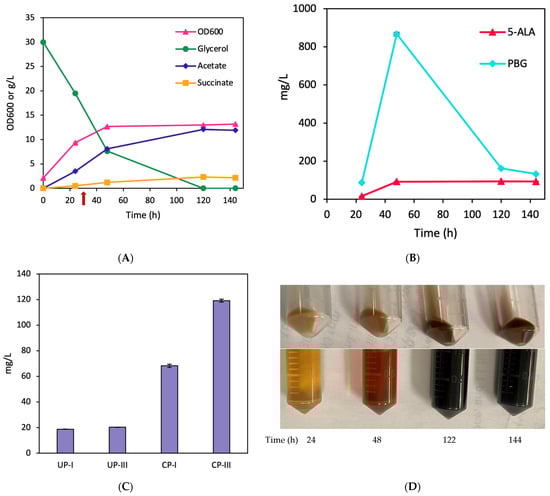 Cultivation of BA002 showed normal cell growth with rapid glycerol consumption and significant acetogenesis (Figure 3A). The strain produced 5-ALA and PBG, with peak levels of 99.7 mg/L (5.4 mg/OD600/L) and 665.7 mg/L (35.7 mg/OD600/L), respectively (Figure 3B). Additionally, the BA002 culture had intensified pigmentation, producing 84.3 mg/L (0.6% yield) and 182.1 mg/L (1.4% yield) of CP-I and CP-III, respectively (Figure 3C,D), with 17.5 mg/L and 20.1 mg/L of UP-I and UP-III being produced as side products, respectively (Figure 3C). The results suggest that a higher expression level of the native HemE was critical for CP production.