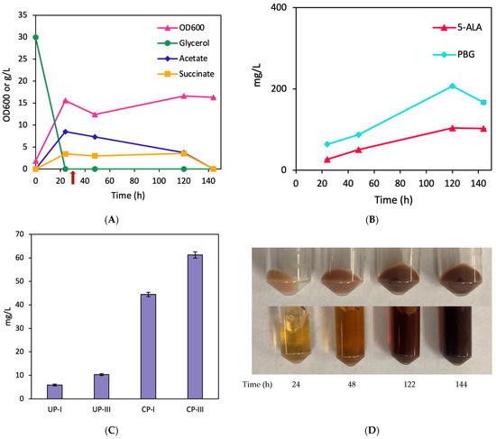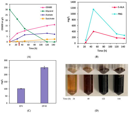 Aerobic bioreactor cultivation of BA005 for porphyrin biosynthesis. Time profiles of (A) cell density (OD600), glycerol consumption, and acetate/succinate formation (the red arrow shows glycine supplementation), (B) 5-ALA and PBG biosynthesis, and (C) CP biosynthesis. (D) Image of CFM and cell paste samples at different time points. All values are reported as means ± SD (n = 2).