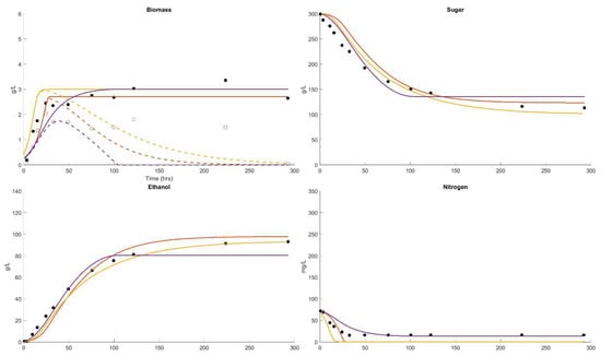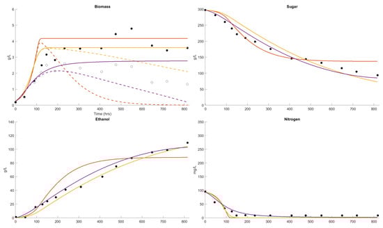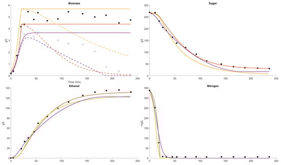 Dataset 1 Fit. Fermentation was performed at 11 °C and the sugar, biomass, nitrogen, ethanol (closed circle) and viable biomass (open circle) were measured []. The fits of the Boulton model (purple), Coleman model (orange) and AWRI model (yellow) were compared. The parameter solution sets were and .
