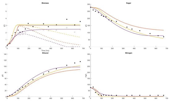 Dataset 2 Fit. Fermentation was performed at 15 °C and the sugar, biomass, viable biomass, nitrogen and ethanol were measured []. The fits of the Boulton model (purple), Coleman model (orange) and AWRI model (yellow) were compared. The parameter solution sets were and .
