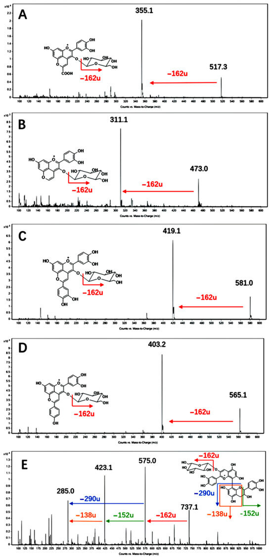 The polymeric pigments formed by anthocyanins and phenolics via direct linkage were also detected (Figure 2E). The precursor ion at m/z 737 exhibited fragment ions at m/z 575, 423, and 285. Based on previous reports, the fragment ions at 575 were speculated to result from neutral loss of the glucose moiety (−162 u), while m/z 423 and 285 were attributed to either cleavage products from the neutral loss of (epi)catechin (−290 u) or the cleavage product of (epi)catechin moiety following Retro–Diels–Alder (RDA) fission (−138 u) [28]. Other polymeric pigments, formed by the anthocyanins and tannins with higher polymerization degrees (such as dimer, trimer etc.) that are commonly seen in red wines [31], were not detected.