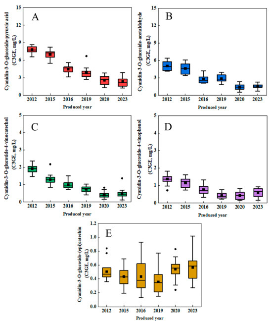 Concentrations of the non-bleachable pigments were analyzed by HPLC-ESI-MS/MS, and the results were presented in Figure 3. First, the aging times were found to be positively correlated with the concentrations of pyranoanthocyanins. As the aging time increased, both the mean and median values of these pyranoanthocyanins, including yanidin-3-O-glucoside-pyruvic acid, cyanidin-3-O-glucoside-acetaldehyde, cyanidin-3-O-glucoside-4-vinocatechol, and cyanidin-3-O-glucoside-4-vinophenol, increased. However, for the polymeric pigments (cyanidin-3-O-glucoside-(epi)catechin), their concentrations were impacted by prolonged aging. Specifically, the mulberry wine aged for 12 years (produced in 2012) showed cyanidin-3-O-glucoside-pyruvic acid, cyanidin-3-O-glucoside-acetaldehyde, cyanidin-3-O-glucoside-4-vinocatechol, and cyanidin-3-O-glucoside-4-vinophenol concentrations as 5.08, 1.92, 7.81, and 1.37 mg/L (on average), respectively. While the concentration of cyanidin-3-O-glucoside-(epi)catechin was 0.50 mg/L, which was significantly lower than the pyranoanthocyanins.