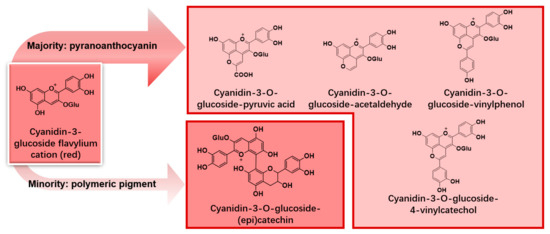 For example, the color of grape red wine evolves ‘from purplish-red to brick red’ over time [8]. It is because the colors of young red wines are primarily determined by the free anthocyanins, while the old red wines are severely impacted by anthocyanin derivates. The pyranoanthocyanins originate from the reactions of anthocyanins and other wine molecules like pyruvic acid and acetaldehyde, and the polymeric pigments are the products of condensation between the anthocyanins and tannins [9]. Both pyranoanthocyanins and polymeric pigments show more stable colors than free anthocyanins.