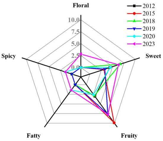 Referencing previously published studies [23,24,36,37,38,39,40], the volatile compounds were classified into fruity, balsamic, solvent, floral, herbaceous, sweet, fatty, green, and spicy odorant series. Then, the total OAVs of each series were obtained by combining the OAV values of the corresponding compounds and presented them as odor profiles (Figure 5). Among the series, the fruity, sweet and floral odor characters made the highest contributions to the aged mulberry wines, which was similar to the observation made by Butkhup et al. [23]. Furthermore, the mulberry wines produced in 2015, 2019, and 2023 showed higher fruity characters than the other samples, while the mulberry wine produced in 2018 and 2023 showed the highest sweet character.