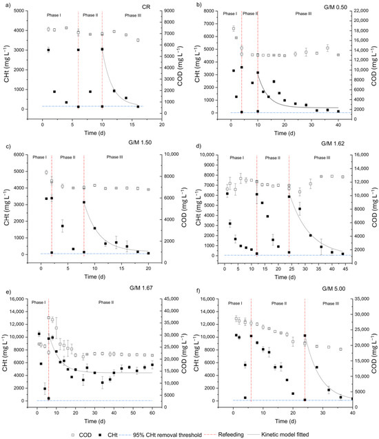 Additionally, the reactors were compared using the CHt conversion efficiency (ECCHt; %) (Equation (2)), in which [CHt]i is the initial CHt concentration (mg L−1) and [CHt]f is the final CHt concentration in each phase (mg L−1). The COD removal efficiency (ERCOD; %) was also obtained using a calculation analogous to that shown in Equation (2) by simply replacing [CHt] values with the initial and terminal COD levels in each phase. Finally, the distribution of soluble metabolites measured at the end of each phase was compared to verify the establishment of distinct metabolic pathways under the experimental conditions investigated.