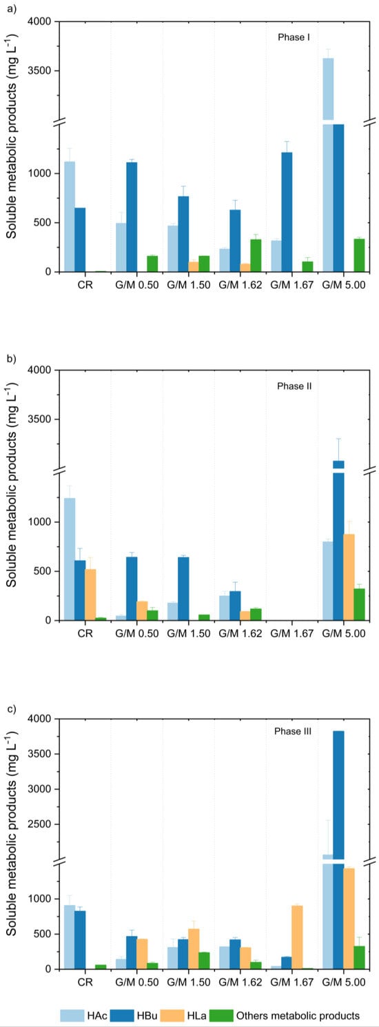 Concentration of soluble metabolites in the control reactor (CR) and in the different glucose-to-melanoidin (G/M) ratios according to the experimental phase: (a) Phase I, (b) Phase II, and (c) Phase III. Nomenclature: HAc—acetic acid, HBu—butyric acid, HLa—lactic acid. Other metabolites include n-butanol, ethanol, propionic acid, iso-butyric acid, iso-valeric acid, valeric acid, and caproic acid.