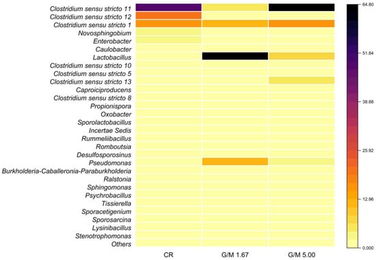 Heat map of the relative abundance (RA; %) of the different genera detected in biomass samples collected from the control reactor (CR) and from reactors subjected to glucose-to-melanoidin (G/M) ratios of 1.67 and 5.00 based on amplicon sequencing of the 16S rRNA gene. Criterion for presenting the genera: RA ≥ 0.1% in at least one sample. Shades of black and yellow indicate higher and lower abundances, respectively.