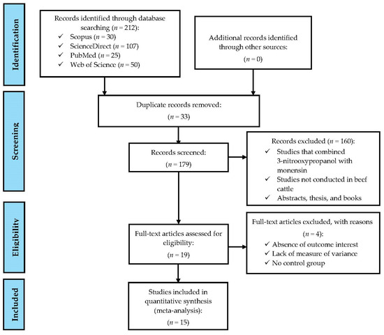 Initially, 212 peer-reviewed manuscripts were identified through the searches. Duplicate documents were first removed from these manuscripts. Subsequently, from the remaining documents, those that had one or more of the following characteristics (exclusion criteria) were eliminated: (1) review articles, simulations, books, or conference proceedings; (2) studies that did not use beef cattle as experimental units; and (3) studies that did not use 3-NOP or combined 3-NOP with monensin or another additive. Finally, to be included in the final database of the meta-analysis, the remaining documents had to meet each of the following characteristics (inclusion criteria), similar to those reported in previous meta-analysis [27,28]: (1) peer-reviewed manuscripts published in the English language; (2) studies that used beef cattle as experimental units; (3) studies that measured and reported data on growth performance, ruminal fermentation, or enteric CH4 emissions (measured with the sulfur hexafluoride “SF6” tracer technique, the Green-Feed system, or respirometry chambers); (4) studies that compared the effect of dietary inclusion of 3-NOP versus a control treatment (diet without 3-NOP) using the same basal diet; (5) studies that indicated the dose (mg/kg DM) of 3-NOP added to the experimental diets or had information necessary to estimate it; (6) studies that reported data on treatment means, standard error of the mean (SEM) and number of experimental units (n) of the experimental diets (diets added with 3-NOP) and control diets (diets without 3-NOP).
