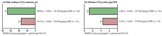 Figure 2a shows that the daily CH4 emission decreased (p < 0.001), regardless of the dose of 3-NOP included in the diet. However, the reduction in daily CH4 emission was greater (WMD = −68.29 g/d) with high doses (101–329 mg/kg DM) of 3-NOP than with doses between 35 and 100 mg/kg DM (WMD = −34.75 g/d). Similarly, CH4 yield decreased (p < 0.001) regardless of the 3-NOP dose used (Figure 2b). However, the reduction in the CH4 yield was greater (WMD = −6.82 g/kg DM) when high doses (101–280 mg/kg DM) of 3-NOP were used than when the dietary inclusion of 3-NOP ranged from 35 to 100 mg/kg DM (WMD = −3.56 g/kg DM).