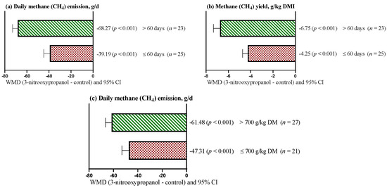 Figure 3a shows that the daily CH4 emission decreased (p < 0.001) regardless of the 3-NOP supplementation period. However, the reduction in daily CH4 emission was greater (WMD = −68.29 g/d) when supplementation periods lasted more than 60 days compared to supplementation periods of up to 60 days (WMD = −39.19 g/d). Likewise, CH4 yield decreased (p < 0.001) regardless of the 3-NOP supplementation period used (Figure 3b). However, the reduction in CH4 yield was greater (WMD = −6.75 g/kg DM) when supplementation periods lasted more than 60 days than with supplementation periods of up to 60 days (WMD = −4.25 g/kg DM). On the other hand, the daily CH4 emission decreased (p < 0.001) regardless of the amount of concentrate included in the diets (Figure 3c). However, the reduction in daily CH4 emission was greater when 3-NOP was included in diets with more than 700 g/kg DM of concentrate (WMD = −61.48 g/d) than when 3-NOP was included in diets with up to 700 g/kg DM of concentrate (WMD = −47.31 g/d).