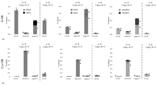 Sulfanylalkyl alcohols and acetates released and/or biosynthesized (%) upon fermentation of a wort (15 or 6 °P) spiked with (a) 15 mg/L of G-3SHol, -3SPol and -3S4MPol or (b) 15 mg/L of Cys-3SHol, -3SPol and -3S4MPol. Values with different letters are significantly different (p < 0.05) according to the Student–Newman–Keuls test (in italic for acetates).