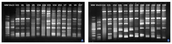 Genomic sequences of 20 and 30 S. cerevisiae strains from Chardonnay and Viognier, respectively, were amplified with δ12 and δ21 primers [] to reach intraspecific differentiation. The interdelta sequence typing analysis revealed 13 distinct profiles from Viognier, comprising the following groups: I (V3, V4, V5); II (V6, V21, V24); III (V9, V10, V18); IV (V15, V16); V (V25, V26, V28, V29, V30, V40, V42, V44, V45); VI (V7); VII (V8); VIII (V13); IX (V14, V23); X (V22); XI (V27); XII (V33, V35); XIII (V34) (Figure 2A). Regarding S. cerevisiae isolates from Chardonnay, 12 different patterns were found: I (C31, C43, C48, C49, C50, C52); II (C45, C53, C54); III (C35); IV (C40); V (C42); VI (C18, C55); VII (C29); VIII (C15); IX (C41); X (C46); XI (C44); XII (C14) (Figure 2B). It is important to emphasize that several strains presented the same molecular profile. Therefore, before further characterization, a discrimination phase was carried out and only one strain of each profile was selected. Another important fact to mention is that none of the genetic profiles matched the evaluated commercial yeast strain.