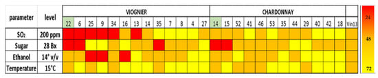 Laboratory-scale vinifications were carried out using selected yeasts in 2 L glass flasks with 1.7 L of either fresh Viognier or Chardonnay grape must. The characteristics of the initial grape musts are presented in Table 1. The fermentations were conducted at 15 ± 1 °C under static anaerobic conditions. Grape musts were treated with potassium metabisulfite solution to achieve a concentration of 50 mg/L of SO2.