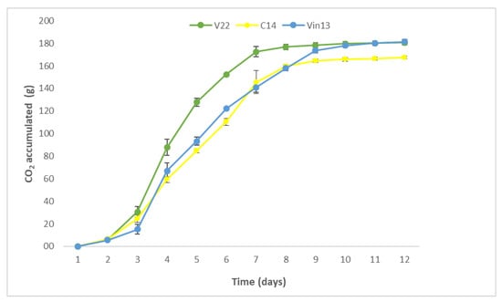 A comparison of the fermentation kinetics among V22, C14, and Vin 13 revealed that V22 had the shortest lag phase of the three strains (Figure 4), indicating a quicker and more efficient onset of fermentation compared to C14 and Vin 13. Conversely, C14 displayed the lowest CO2 production, resulting in a lower ethanol yield than the other two strains. Although the commercial yeast had the longest lag phase, it managed to match the fermentation dynamics of the V22 strain. It is worth mentioning that the fermentations were conducted over a period of 12 days.