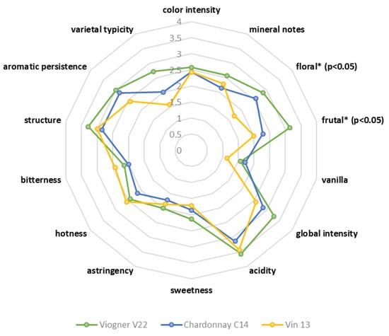 The diagram shows the sensory analysis conducted on the wines obtained on a laboratory scale. Viognier with V22 yeast, Chardonnay with C14 yeast, and Chardonnay obtained with commercial yeast Vin 13. (* indicates significant difference).