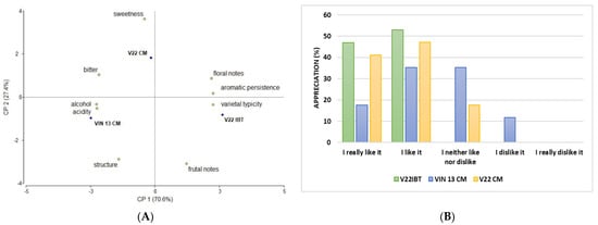 (A) Principal component analysis (PCA) of sensory attributes obtained from tasting by a trained panel, and (B) results of the preference analysis obtained from the hedonic tasting of wines on a pilot and industrial scale.