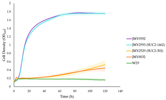 As depicted in Figure 2, the W29 strain was unable to grow in the minimal medium, thus serving as a negative control. The JMY2529 and JMY8032 strains express only one copy of a weakly secreted SUC2 gene (SUC2-302), which only allows a slow growth in a minimal medium supplemented with sucrose, as previously reported [40]. Both strains showed similar slow growth rates. On the other hand, the JMY2593 strain, which was generated in the aforementioned study, expressing a new cassette (SUC2-1462) with an optimal expression of the invertase enzyme, showed an optimal growth in sucrose-based media and thus served as a positive control [40]. The newly generated JMY9392 strain showed a similar growth rate to the JMY2593 strain, reaching a maximum growth rate on sucrose. Therefore, unlike the chassis strain JMY8032, the JMY9392 strain has the ability to efficiently assimilate the disaccharide sucrose present in any culture media.