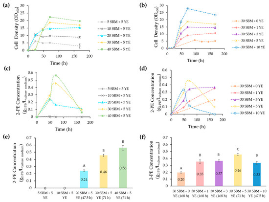 The profile of the JMY9398 strain growth and of 2-PE production as a function of time in media composed of varying concentrations of SBM supplemented with different YE concentrations. (a,b) Yeast growth over time using cell density (OD600); (c,d) 2-PE production over time in the different media formulations; (e,f) maximal production of 2-PE in each medium. Error bars represent the standard deviation of biological replicates for each condition. Different uppercase letters indicate significant differences between the 2-PE titers in the different culture media (p < 0.05). SBM: sugar beet molasses; YE: yeast extract; 2-PE: 2-phenylethanol.