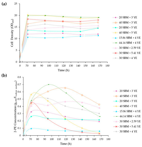 Figure 4a presents the JMY9398 yeast growth throughout the fermentation in the 19 experiments performed, and Figure 4b shows the production of 2-PE throughout the 168 h fermentation, alongside the maximal 2-PE concentrations (g2-PE/Lculture medium) in each of the culture media compositions, respectively.