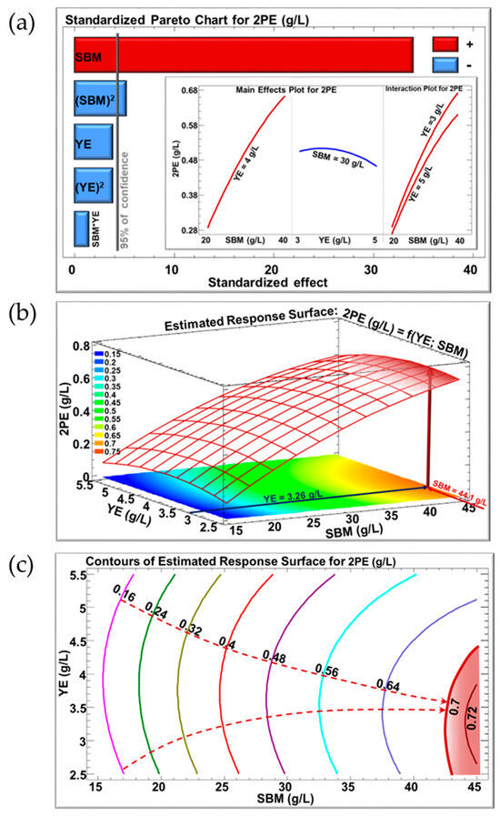 The Pareto Chart (Figure 5a) illustrates the significance of the assessed factors on the 2-PE concentration (g2-PE/Lculture medium). Bars extending beyond the vertical line indicate statistical significance with a confidence level exceeding 95%. The chart shows a positive linear effect and a slightly negative quadratic effect for SBM, whereas YE exhibits negative linear and quadratic effects, both of which are marginally significant. There was no significant interaction effect between SBM and YE, indicating that 2-PE concentration varied independently of the second factor. The inserts in Figure 5a show the variation of 2-PE according to one factor, ranging from a low (−1) to a high level (+1), with the other variable fixed at the central level (0). Increasing the SBM concentration from 20 to 40 g/L significantly increased 2-PE production. Conversely, increasing the YE concentration from 3 to 5 g/L resulted in a slight decrease in 2-PE production. The interaction plot suggests that a 3 g/L YE concentration slightly increases 2-PE production compared to 5 g/L YE.