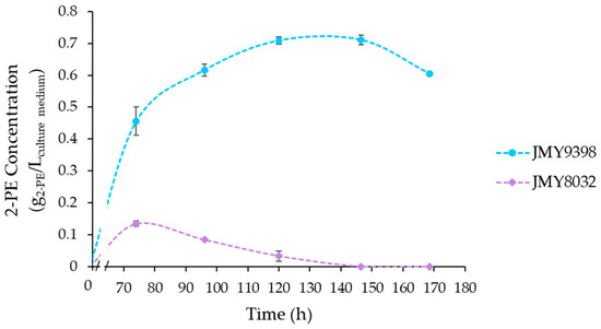 Based on the results of Section 3.2 and Section 3.3, the optimal culture media composition was tested to verify the predictions of the design. Fermentations in 44.14 g/L SBM and 3.2 g/L YE were performed using the JMY9398 strain. As shown in Figure 6, 0.71 ± 0.02 g/L of 2-PE were produced after 146 h of fermentation. The obtained value was not significantly different (p > 0.05) from the predicted one provided by Statgraphics (0.72 g/L 2-PE). The obtained 2-PE titer was 26.8% higher than the initial value before the optimization process (0.56 g/L versus 0.71 g/L 2-PE).