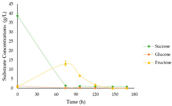 Upon evaluating sugar consumption in the culture medium for JMY9398, it was observed that sucrose was completely consumed within 24 to 48 h after initiating fermentation. As sucrose was being degraded, the concentrations of glucose and fructose increased in the medium. Subsequently, once sucrose was exhausted, glucose was rapidly consumed, followed by fructose (Figure 7), which is coherent with previous findings [40]. A complete depletion of sugars in the media was observed by the end of the fermentation.