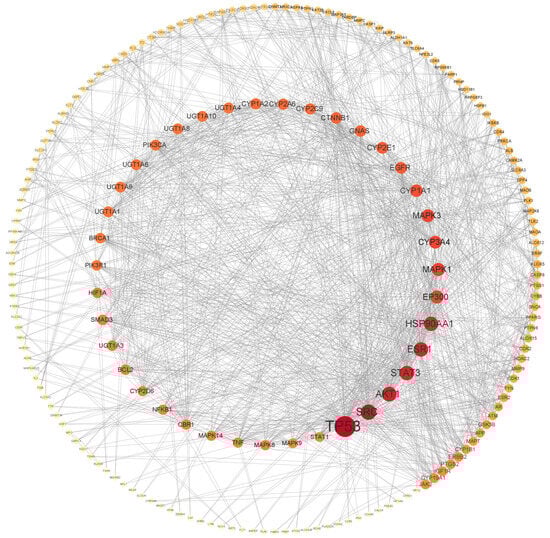 The STRING database was used to determine the interaction relationships of the effective FH06 targets, and Cytoscape v.3.9.1 software was used to analyze the topology of the FH06 effective target protein–protein interaction (PPI) network. With the degree value as the condition, the effective targets were sorted, the dots were the effective targets, and each edge was the target interaction relationship. The number of nodes in the PPI network diagram (Figure 1) was 193, the number of edges was 1360, and the clustering coefficient was 0.411. The larger the degree value, the larger the node, and the darker the color, the more biological functions the node plays and the stronger its biological importance []. The diagram shows that TP53, SRC, AKT1, STAT3, ESR1, and other target networks play important roles in this process and may be key targets of FH06 in the regulation of fat metabolism.