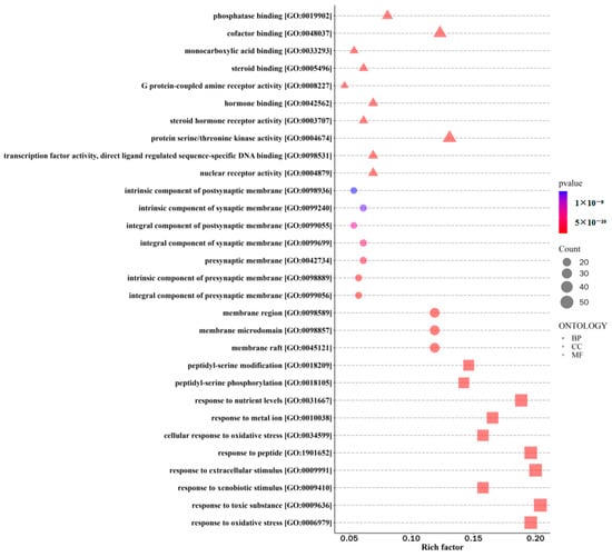The GO database contains functional information about genes involved in biological processes (biological process, BP), cellular components (cellular component, CC), and molecular functions (molecular function, MF). In this chapter, we mapped genes to each node of the Gene Ontology database and performed functional enrichment analysis using GO (http://www.geneontology.org/, accessed on 12 March 2024), obtaining 2906 BP, 112 CC, and 369 MF terms. The GO analysis results of the target proteins are displayed in the form of a bubble chart (taking the top 10 entries of each GO category for display, Figure 2).