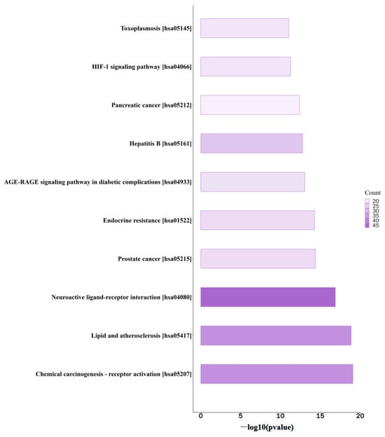 In the figure, the x-coordinate is –log10 (p-value), and the y-coordinate is the path name. In the figure, the length of the column represents the size of the p-value, and the longer the column is, the smaller the p-value. The darker the color is, the more target proteins are mapped to the pathway.