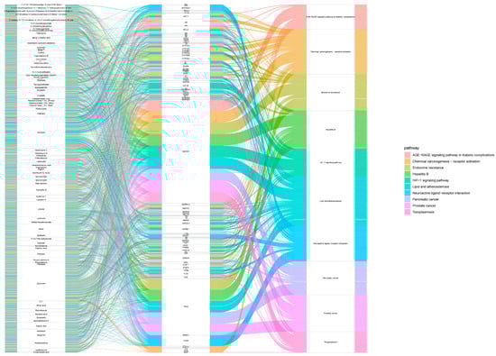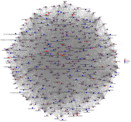 Network pharmacology is an interactive network based on “disease–gene target medicine” using computer analysis technology combined with biology and pharmacology to explain the occurrence and development of diseases from the perspective of systems biology and biological network balance []. From the perspective of the system and molecular level, this study reveals the complex mechanism of action of traditional Chinese medicine on the body and guides the discovery of new drugs. From the original “one target, one drug” model to the new network target, multi-component model, a new herbal network pharmacology method is established, which opens up a new research model for predicting the targeting map and pharmacological effects of herbal compounds and reveals the correlation of drug–gene–disease synergy modules. Network pharmacology has become an effective strategy for transforming traditional Chinese medicine from empirical medicine to evidence-based medicine.