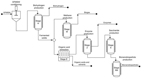 The Environmental Biotechnology and Renewable Energies Group (GBAER, for its acronym in Spanish) from CINVESTAV, IPN, Mexico, have developed a BRF that processes MSW where conventional recyclable materials such as aluminum, iron, and plastics are recovered, and the organic fraction of MSW (OFMSW) is separated and used as a feedstock for the BRF. This BRF consists of a network of physical, physicochemical, biological, and auxiliary processes that convert the OFMSW into bioenergies and bioproducts as final products [18,25].