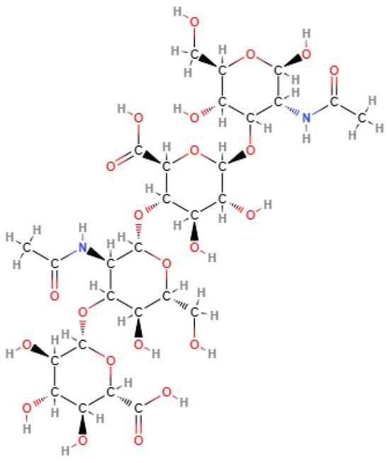 HA is a linear polysaccharide constituted of 2000 to 25,000 units (disaccharides) of N-acetylglucosamine and glucuronic acid joined alternately by β-1-3 and β-1-4 glycosidic bonds, as shown in Figure 2. HA is negatively charged, highly hydrophilic, and forms viscous and dense network at high molecular weight [75,76].