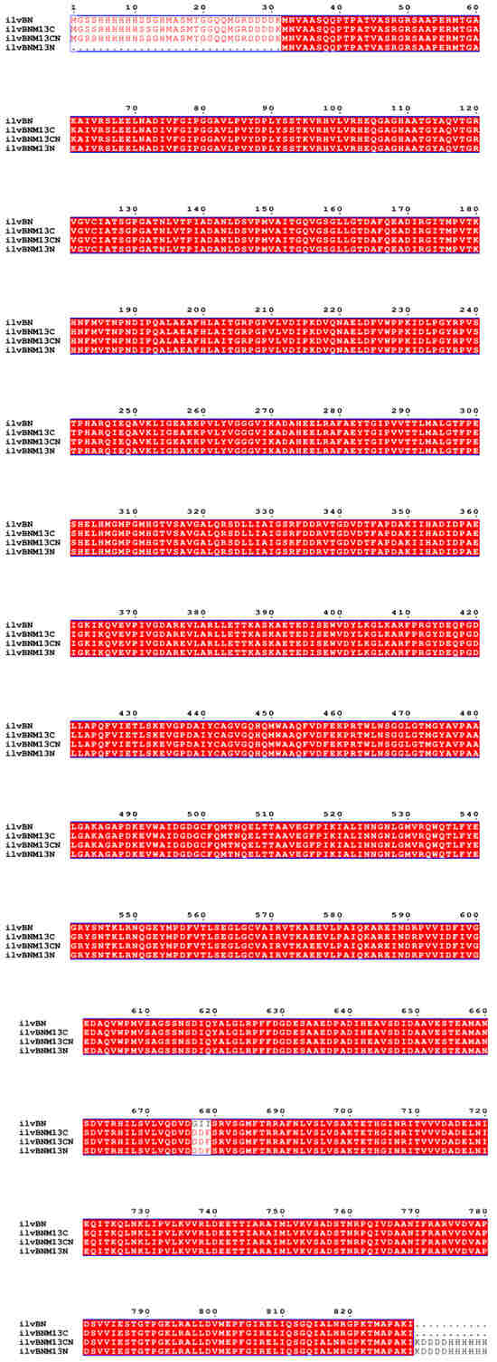 According to a previous study, mutating glycine at position 20 and isoleucine at position 21 to aspartic acid and isoleucine at position 22 to the phenylalanine of the CSU of C. glutamicum AHAS can completely release the feedback inhibition of L-valine by AHAS [13]. We mutated amino acids at positions 20–22 of C. glutamicum ilvN (G20D, I21D, and I22F) and introduced them into E. coli for expression to obtain an AHAS that rescued the feedback inhibition of L-valine, which was then sequenced after validation by PCR, and the correctly sequenced mutant was named ilvBNM13. Selective addition of EKase sites and His tags at both ends based on the correctly sequenced AHAS yielded M13CN that had EKase sites and His tags at both ends, the C-terminus M13C with EKase site and His tag, and M13N with EKase site and His tag at the N-terminus.