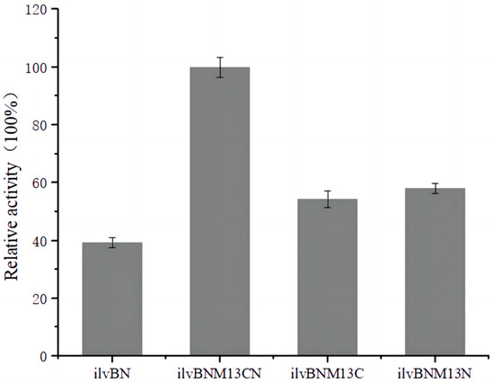 In the E. coli isoenzyme AHAS III, the binding site for valine and the RSU is in the surface region near the N-terminal structural domain, where L-valine interacts with aspartic acid at positions 11 and 29 through hydrogen bonding and its side chain interacts with leucine at positions 9 and 16 with valine at position 35 in the hydrophobic space conformation [14]. After altering the E. coli AHAS III RSU at positions 14 glycine and 11 aspartic acid, the feedback inhibition sensitivity of L-valine was reduced, suggesting that this region may be the binding site for L-valine [15]. A similar region has been observed in C. glutamicum; AHAS III was less sensitive to feedback inhibition by L-valine, suggesting that this region is likely a binding site for L-valine. Similar sites are found in C. glutamicum, where changes in amino acids at positions 20–22 of the RSU of AHAS relieve feedback inhibition by L-valine. In the aforementioned experiments, we obtained wild-type AHAS expressed in E. coli BL21 by constructing pET-28a-ilvBN, pET-28a-ilvBNM13, pET-28a-ilvBNM13C, pET-28a-ilvBNM13N, and pET-28a-ilvBNM13CN vectors with labeling positions. Three different AHASs, as described in Section 2, were measured for wild-type and mutant AHAS activities, respectively, as shown in Figure 2 The enzyme activity of M13 mutant AHAS containing tags at both ends was used as 100% to compare the relative enzyme activities of wild-type AHAS and the other two M13 mutant AHAS with different tag positions. The enzyme activity of the mutant AHAS was higher than that of the wild-type AHAS, probably because the changes in amino acids at positions 20, 21, and 22 in the AHAS RSUs enhanced the interaction between RSU and CSU and increased enzyme activity. However, the enzyme activity decreased after removing the EK enzyme site and the His tag at either end, suggesting that the presence of the tag had some effect on enzyme activity (Figure 2).