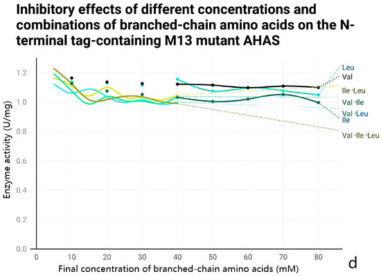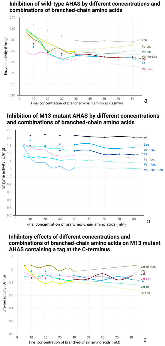 Feedback inhibition of wild-type and M13 mutant AHAS by different combinations of branched-chain amino acids. The x-axis is the final concentration of three different combinations of branched-chain amino acids in the enzyme activity assay system in mM, and the y-axis is the enzyme activity in the presence of different final concentrations of branched-chain amino acids in U/mg. (a) The inhibition of wild-type AHAS by different concentrations and combinations of branched-chain amino acids; (b) the inhibition of M13 mutant AHAS by different concentrations and combinations of branched-chain amino acids; (c) the inhibition of C-terminal M13 mutant AHAS containing a His tag and an EKase site by different concentrations and combinations of branched-chain amino acids; (d) the inhibition of N-terminal M13 mutant AHAS containing a His tag and an EKase site, and the inhibition of M13 mutant AHAS containing a His tag and an EKase site at the N-terminus by different concentrations and combinations of branched-chain amino acids.