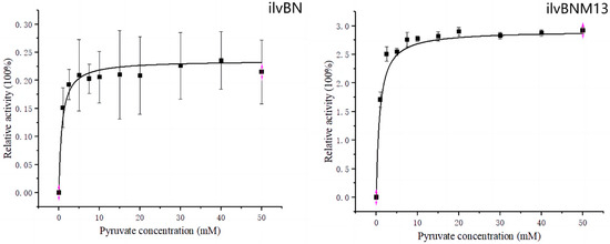 Figure 4 shows the Michaelis–Menten equation fitted by origin 2022, with the enzyme activity at maximum substrate concentration set to 100%, plotted to plot the fit. As shown in Figure 4, the wild-type AHAS reached 10% of the maximum conversions at 5 min into the reaction, and the Km value of wild-type AHAS with pyruvate as the substrate was 4.5253 ± 0.07631 mM. Similarly, the M13 mutant AHAS reached 10% of the maximum conversions 2.5 min into the reaction, with a Km value of 6.3877 ± 0.06232 mM. The time for wild-type and M13 mutant AHAS to catalyze pyruvate to a maximum conversion of 10% was calculated by GraphPad equation Y = Et × cat × X/(Km + X), with Y being the enzyme activity, Et being the enzyme concentration, and kcat being the number of conversions.