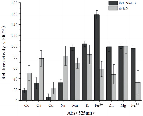 The enzyme activity when Mg2+ was used as a metal ion was defined as 100%, and the data were fitted to origin 2022 and plotted as a bar graph to obtain Figure 5. Figure 5 shows the most suitable metal ions for wild-type and M13 mutant AHAS. The relative enzyme activity of Mg2+ was 100% when Mg2+ was used as a control for comparison with other ions. It can be observed that Mg2+ was the most suitable metal ion for wild-type AHAS, whereas Cu2+ and Fe3+ strongly inhibited the enzyme activity of wild-type AHAS, which was reduced by 80% and 70%, respectively, in the presence of the two ions. For the M13 mutant AHAS, Fe2+ was the most suitable metal ion, increasing the enzyme activity 1.5 times relative to the Mg2+ ion. Among them, Cu2+ most strongly inhibited the enzymatic activity of the M13 mutant AHAS, followed by Co2+, Ca2+, and Na+. None of the other metal ions had a significant inhibitory effect on the enzymatic activity of the M13 mutant AHAS.