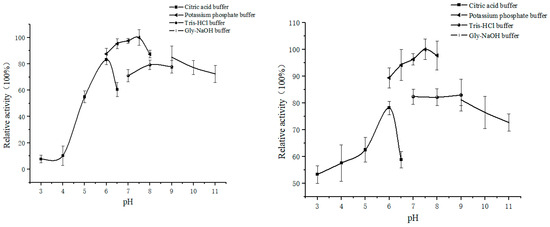 Citrate buffer (pH 3, 4, 5, 6, and 6.5), potassium phosphate buffer (pH 6, 6.5, 7, 7.5, and 8), Tris-HCl buffer (pH 7, 8, and 9), and Gly-NaOH buffer (pH 9, 10, and 11) were formulated and substituted for pH 7.5 potassium phosphate buffer (pH 7.5, 7.5, 7.5, and 8), and pH 10.5 potassium phosphate buffer (pH 9, 10, and 11) was used in the enzyme activity measurement system to determine the optimal pH of wild-type and M13 mutant AHAS in the enzyme activity reaction system. Each analysis consisted of three sets of replicates.