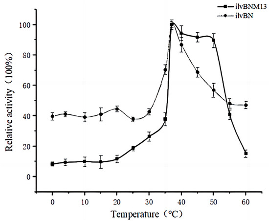 The enzyme activity under optimal temperature conditions was set to 100% and the data were fitted to origin 2022 and plotted to plot a line graph to obtain Figure 7. In terms of the optimal temperature, both wild-type and M13 mutant AHAS had an optimal temperature of 37 °C. However, wild-type AHAS had higher tolerance for both low and high temperatures than M13 mutant AHAS (Figure 7). Below 20 °C, the enzyme activity of wild-type AHAS was 40% of the enzyme activity at the optimal temperature, whereas that of M13 mutant AHAS was only 15% of that at 37 °C. However, in the range of 40–50 °C, M13 mutant AHAS was more tolerant than the wild type, and in this 10 °C temperature interval, the enzyme activity of M13 mutant AHAS changed very little and was above 90 °C of the optimal temperature. Above 50 °C, the activity of M13 mutant AHAS decreased rapidly, and at 60 °C, it was only 15% of that at the optimal temperature of 37 °C.