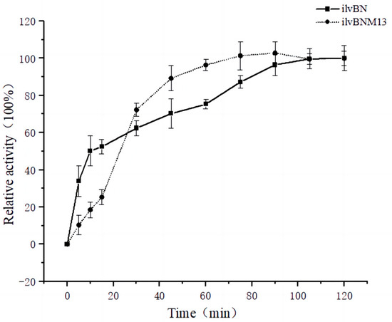 Figure 8 shows the relative enzyme activity versus time for wild-type and M13 mutant AHAS at 37 °C and pH 7.5 potassium phosphate buffer. The enzyme activity of wild-type and M13 mutant AHAS at 120 min was taken as 100% and a line graph was created using origin 2022. Analysis of the effect of time on wild-type and M13 mutant AHAS showed that, based on the original enzyme activity system, the reaction was complete after 90 min of reaction for wild-type AHAS and after 75 min for M13 mutant AHAS. Within 7.5 min, the wild-type AHAS enzymatic reaction showed zero-level reaction kinetics, and the reaction was carried out within 7.5 min as a suitable node for the determination of enzyme activity. Within 30 min, the enzymatic reaction of the M13 mutant AHAS showed zero-stage kinetics, and 30 min was a suitable time point for determining enzyme activity (Figure 8).