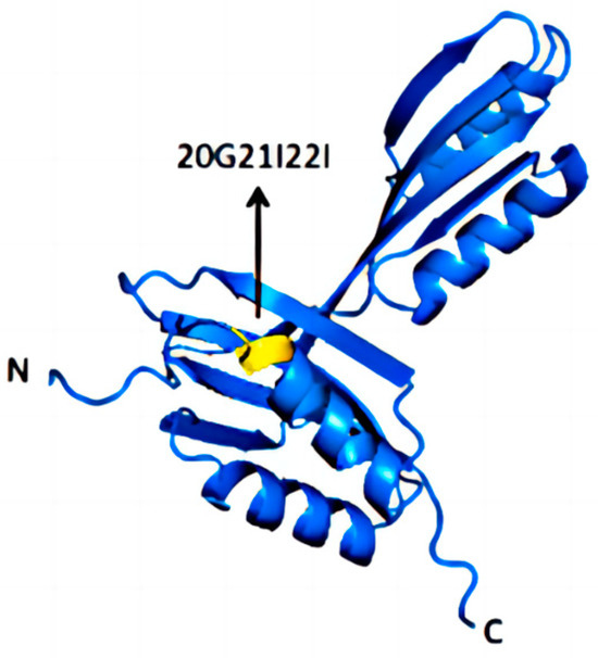 Structure of ilvN. The original ilvN structure is shown in blue, and the positions of the mutated amino acids, glycine at position 20, isoleucine at position 21, and isoleucine at position 22, are shown in yellow.