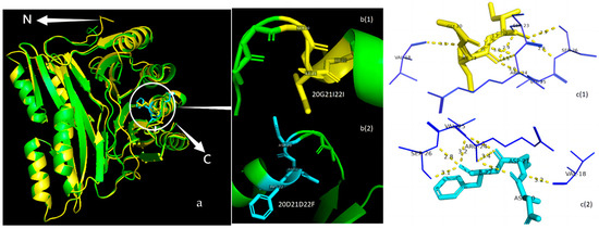 IlvN and ilvB interaction sites. (a) The composite structure of ilvB and ilvN, where the yellow part is ilvN, the green part is ilvB, and the red and blue part is the region of interaction between ilvB and ilvN; (b1,b2) the position of the amino acid structure involving interactions involving ilvB and ilvN as well as the polar bonds in the three consecutive amino acid mutations 20–22, where the yellow dashed line is the hydrogen bond, the blue portion is ilvB, and the red portion is ilvN. (b1) is after the fixed-point mutation, and (b2) is before the fixed-point mutation; (c1,c2) the change in the position and length of the polar bond before and after the mutation. The red portion is ilvN and the blue portion is ilvB. (c1) is after the fixed-point mutation, and (c2) is before the fixed-point mutation.