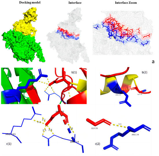 The crystal structures of the CSUs of AHAS from S. cerevisiae, A. thaliana [16,17], and Pseudomonas aeruginosa protease [18] have been reported. In the investigation of the role of residues 20–22 of the RSU in AHAS function, crystal structure simulations of the C. glutamicum RSU revealed that the three consecutive amino acid residues were located exactly at the turn of the N-terminal first α-structural domain initiation (Figure 9). Simulations of its mutated structure revealed that the three amino acid changes did not alter its structure (Figure 10a,b); however, the number and length of its intrachain hydrogen bonds were altered (Figure 10c). Similarly, simulation of the AHAS complex structure and calculation of the molecular docking results of CSU and RSU using PyMOL 2.4 (Figure 11) revealed that of the three consecutively mutated amino acids at positions 20–22 in the RSU, only the amino acid at position 20 was involved in the interaction with CSU (Figure 11b). Before the mutation, the glycine at position 20 was only connected to the arginine at position 24 of the RSU by a polar bond and did not interact with CSU. However, when the glycine at position 20 was mutated to aspartic acid, the aspartic acid at position 20 of the RSU and the arginine residue at position 141 in CSU were connected by two polar bonds, and a relatively strong interaction occurred (Figure 11c).