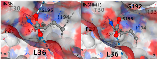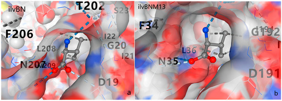 Action sites of L-leucine in AHAS. (a) Action site of L-leucine in M13 mutant AHAS; (b) action site of L-leucine in wild-type AHAS.